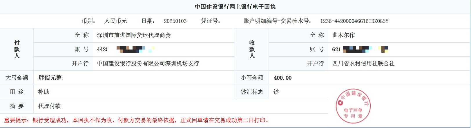 2025年1月,困难家庭爱心资助汇款已支付完成,每户每月400元。