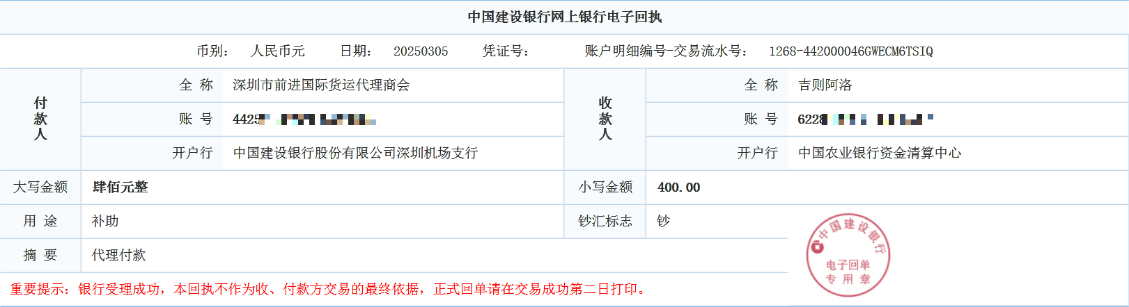 2025年3月,困难家庭爱心资助汇款已支付完成,每户每月400元。